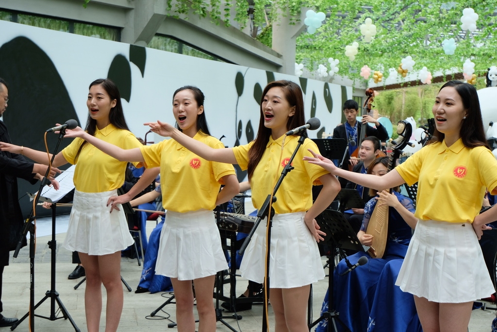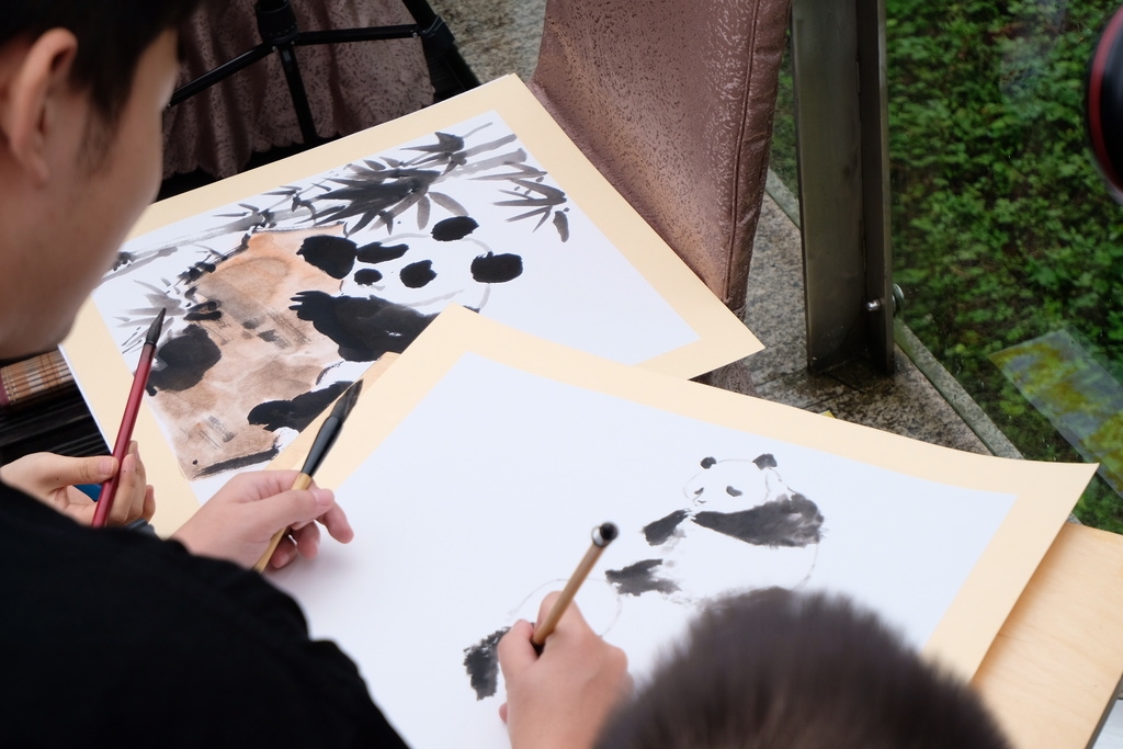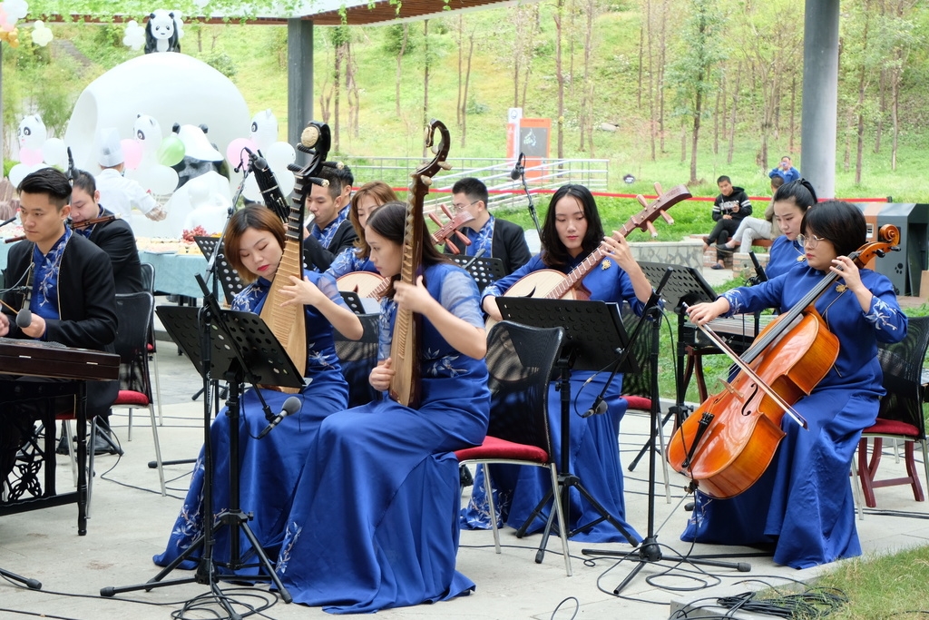 原来,这是来自四川音乐学院的师生们,为熊猫宝贝和前来基地庆生的观众们准备的一场特别的生日礼物、“行走天府——大地艺术季”的音乐会。乐手们演奏了《迎宾曲》《彩云追月》《茉莉花》等传统经典民乐曲目,让国宝熊猫的生日会中国韵味十足,还应景地表演了民乐版的《生日快乐歌》。现场还有不少来自四川音乐学院的“小画手”,用毛笔等迅速勾勒出熊猫宝宝生日图,让整场派对音画兼备。“有研究表明,50分贝以内音乐,有助于大熊猫的身体健康,有舒缓情绪的作用,于是这次我们将经典民乐与大熊猫互动。”四川音乐学院艺术处李芃颖说道。