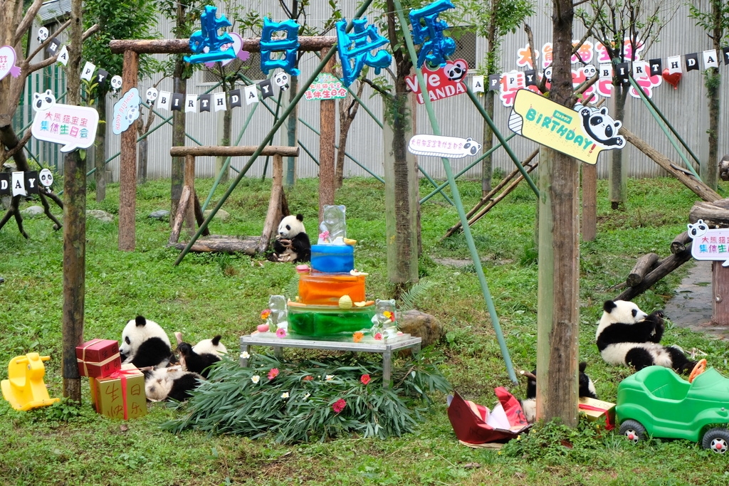 上午十点过,“熊猫萌天团”出动,小家伙们有的迫不及待地拆开礼盒,啃着里面的竹笋,有的坐上了木马玩具,有的直接爬上了三层蛋糕伸手取食,还有的吃饱以后直接把自己挂在了树梢,此时远处渐渐飘荡起生日快乐歌的旋律……