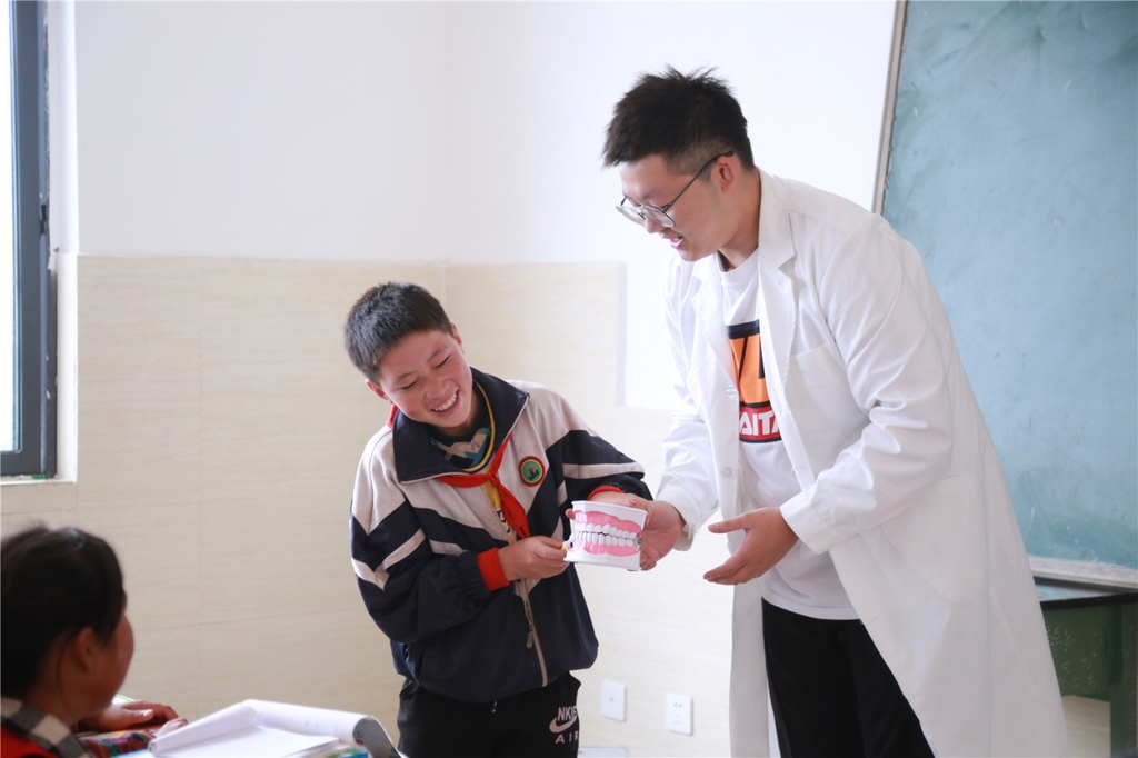 世家口腔健康管理师刘厚超用一副牙齿模型,给孩子们带来了一堂生动的"刷牙课",除了强调一定要一天早晚两次刷牙外,他还仔细地给孩子们示范了刷牙的正确姿势、方向和时间。为了更了解当地孩子们的饮食生活细节,志愿者们还特意前往几位学生家里进行了走访和义诊。