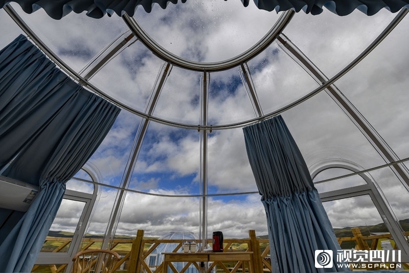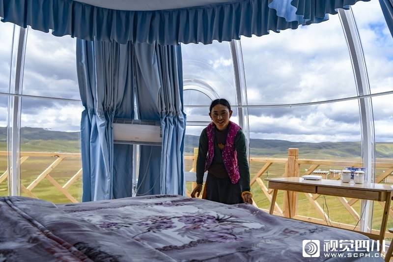 早看浮云,暮看朝霞,夜看星星。在宗塔草原上,新建起的星空帐篷,拉近了人与星星的距离。“这里晚上,可以打开屋顶的窗帘,看得到天空里闪耀的星星,非常清晰,也非常浪漫。”宗塔乡党委书记奇美伦珠带记者参观草原上星空帐篷,全景360度草原观景房,里面电视、空调、淋浴、马桶、洗漱间、无线网络等设施一应俱全。