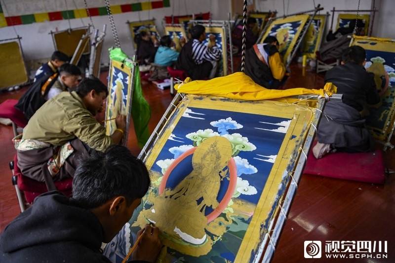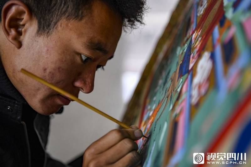 老师甲他泽认正在绘制唐卡