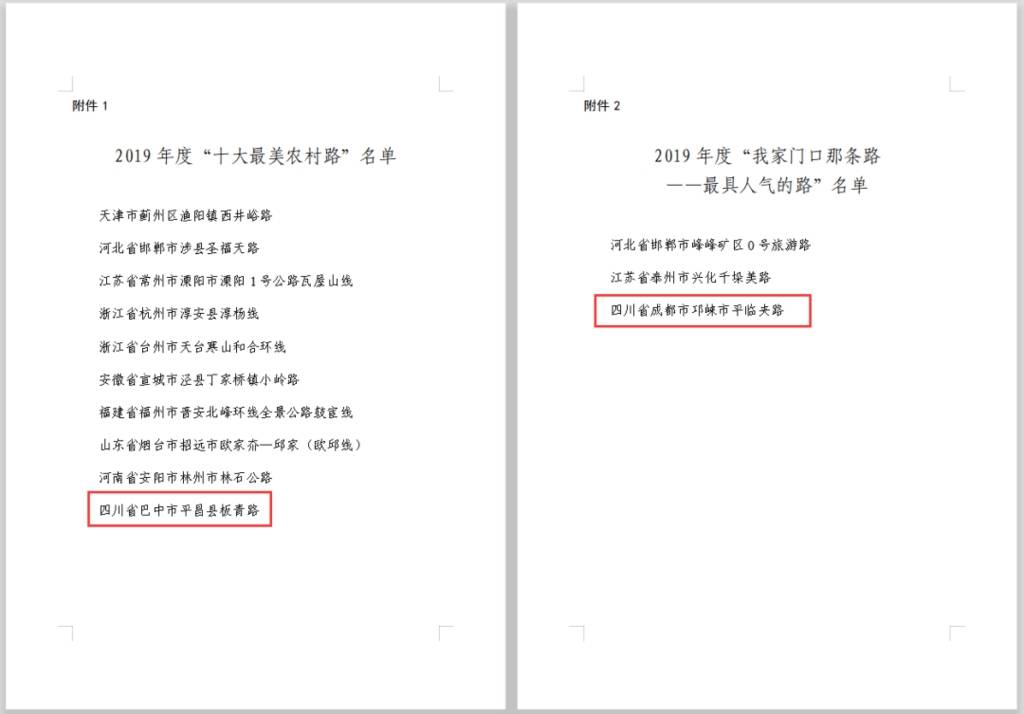 我省两条公路榜上有名,其中,巴中市平昌县板青路被推选为2019年度“十大最美农村路”,成都市邛崃市平临夹路被推选为2019年度“我家门口那条路——最具人气的路”。
