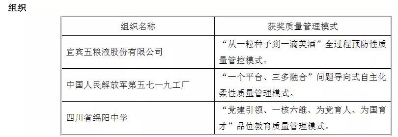 记者9月18日从四川省质量强省工作领导小组办公室获悉,按照《四川省天府质量奖评选管理办法》规定,在自愿申报的基础上,该办组织开展了四川省天府质量奖(以下称天府质量奖)评选活动。经初审推荐、资料审查、材料评审、陈述答辩、现场评审以及四川省天府质量奖评选表彰委员会全体会议审议等程序,拟推荐宜宾五粮液股份有限公司等3家组织(企业)和四川九洲空管科技有限责任公司程旗等2名个人获天府质量奖,千禾味业食品股份有限公司等3家组织(企业)和四川泛华航空仪表电器有限公司邱遥远等4名个人获天府质量奖提名奖。