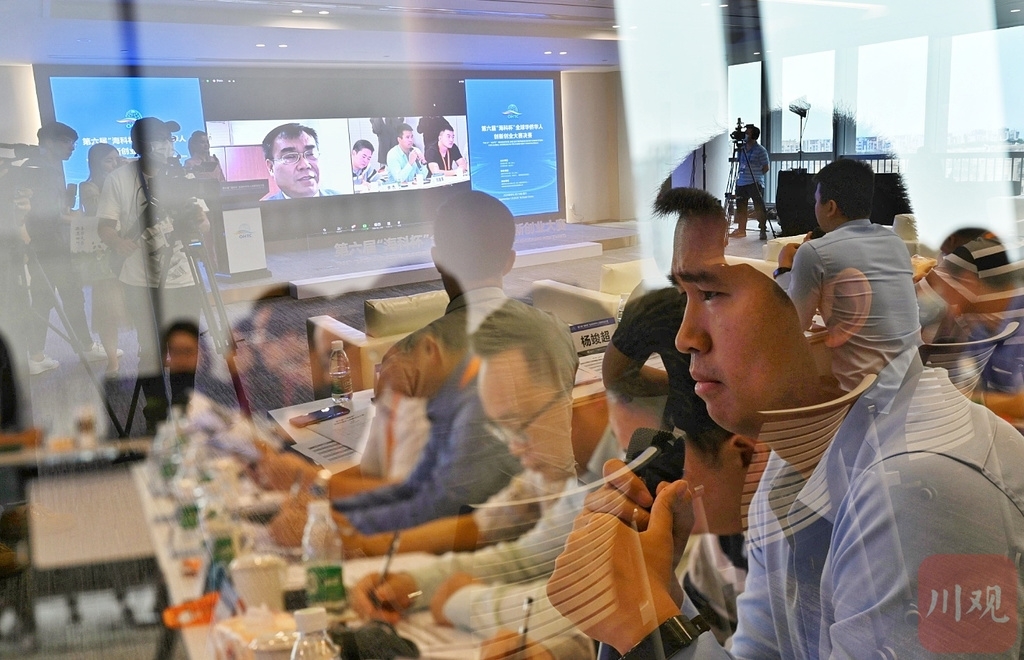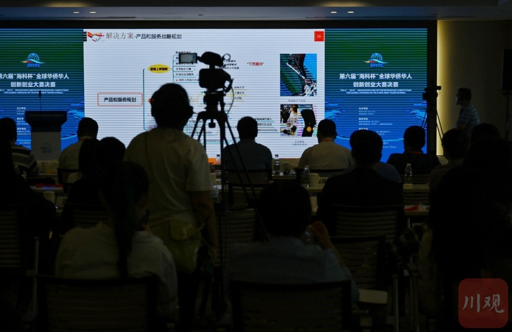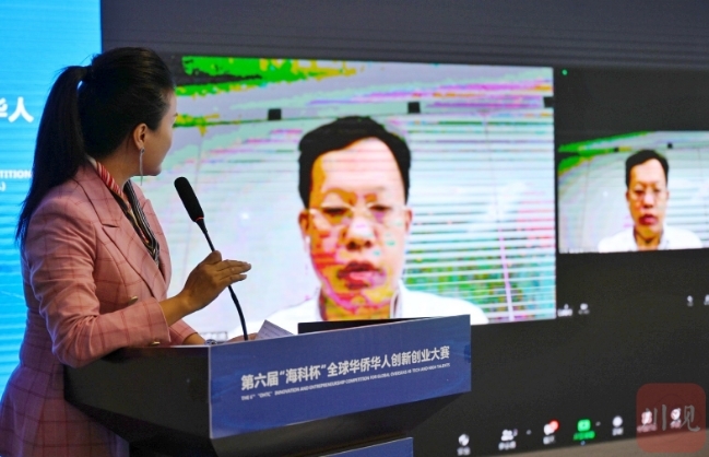 9月19日,第六届“海科杯”全球华侨华人创新创业大赛的决赛在成都举行,今年因疫情,决赛场搬到网上对决。图为参赛选手视频连线“隔空”向10位专业评审进行3分钟答疑。