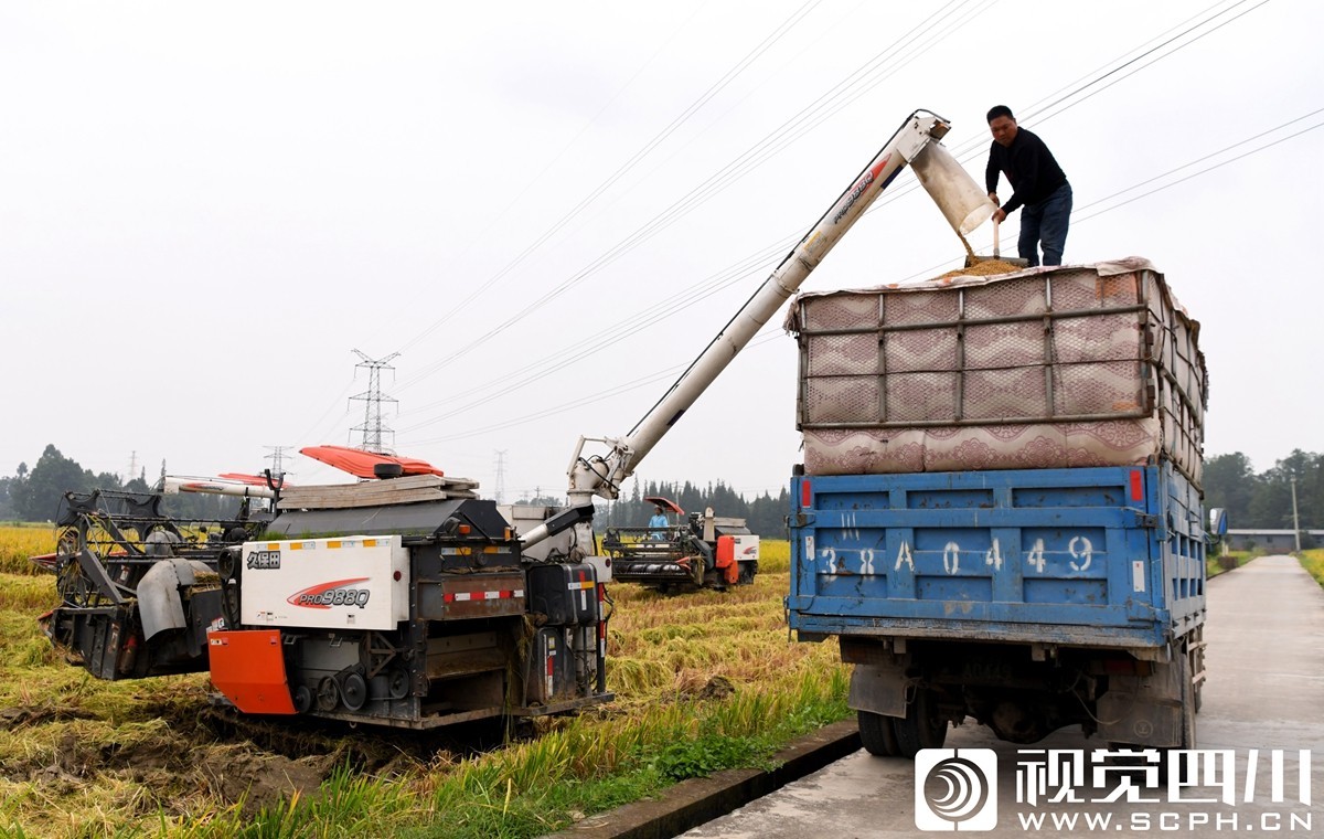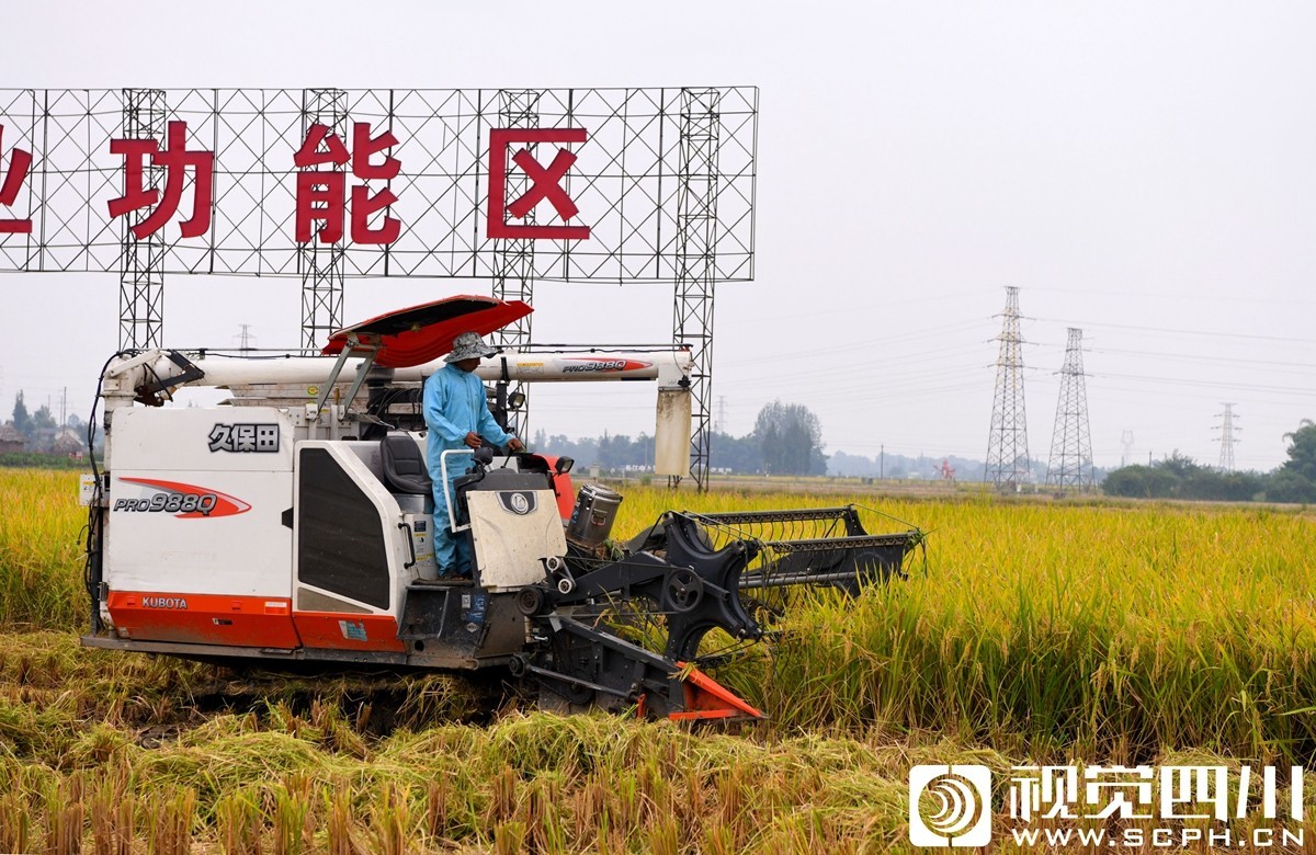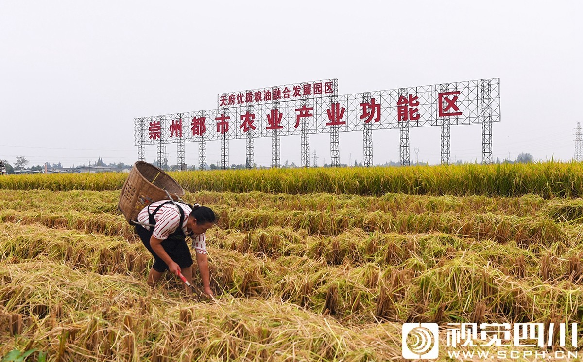 9月19日,伴随着机器的轰鸣声,崇州市粮油融合发展园区内大片金色的麦田正在被收割,村民幸福的在田间捡穗、晒粮,今年又是一个好收成。“现在收粮方便的多了。”收割机工人董广军告诉记者,“以前人工一亩地要割两三天,现在机器一个小时就能割四五亩地,成本也便宜一倍多。”
