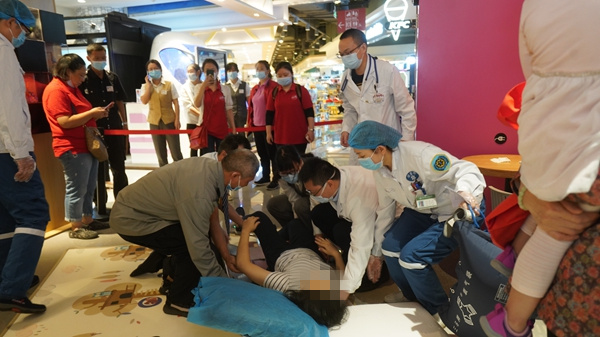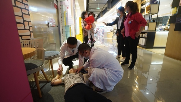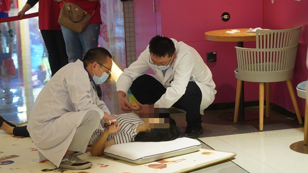 今日上午,川报全媒体特别义诊活动正在成都绿地468的伊藤广场5楼进行。11时许,一位顾客在商场3楼突发抽搐,华西医院骨科王浩洋、心内科荣溪两位医生闻讯后,立即从义诊现场奔跑至患者处。