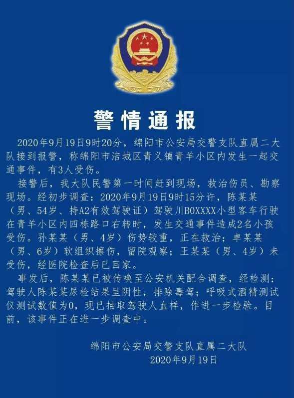 9月19日,有网友在网上称,四川绵阳青羊小区内,一人驾驶车辆在一路口右转时撞伤三名小孩。当天下午,绵阳公安交警直属二大队发布警情通报,事故致两名小孩受伤,司机排除毒驾,呼吸式酒精测试仪测试数值为0,现已抽取驾驶人血样,作进一步检验。目前,事件正在进一步调查中。