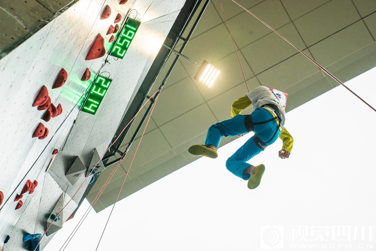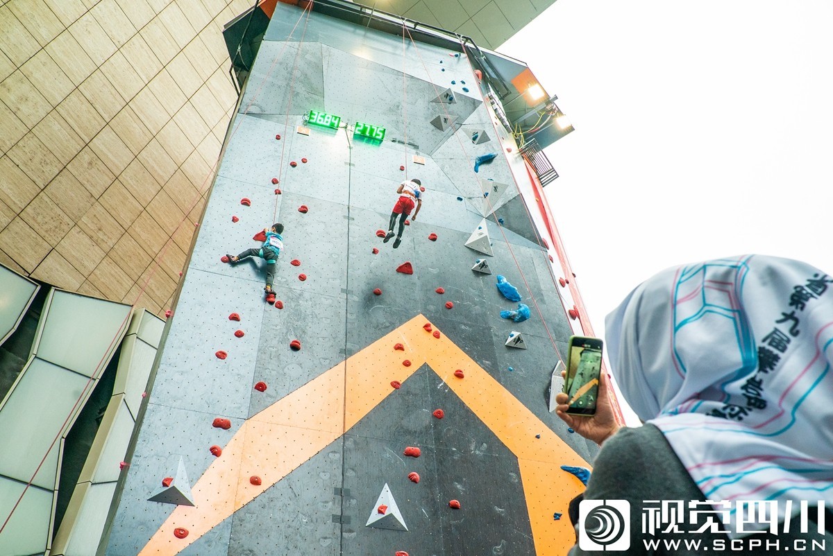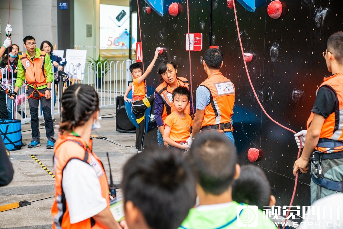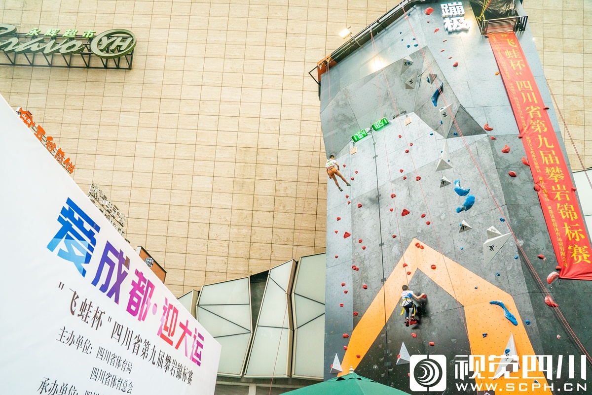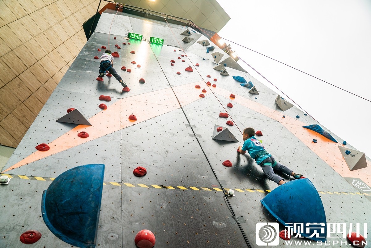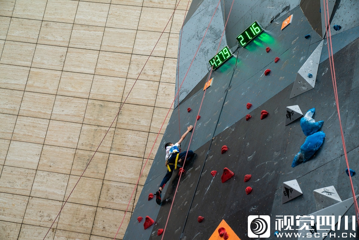 9月20日,成都339天府熊猫塔下,一群年纪轻轻的小运动员正在18米高的岩壁上“飞檐走壁”。