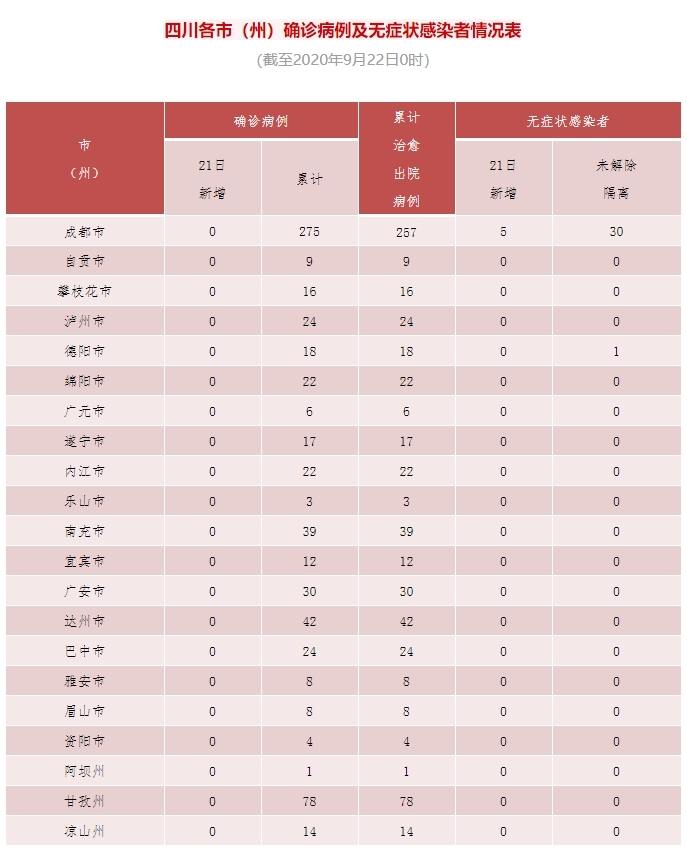 9月21日0-24时,四川无新增新型冠状病毒肺炎确诊病例,新增治愈出院病例2例,无新增疑似病例,无新增死亡病例。