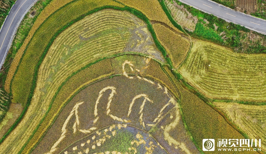 记者在空中用无人机拍摄到:在金黄色的色块里忙碌的身影,绿色田埂形成的优美线条成为了分割线,收割下的谷垛摆放在田间就像是画在地里的笔触,这就是丰收后给大地作的一幅画,诉说着丰收的喜悦……