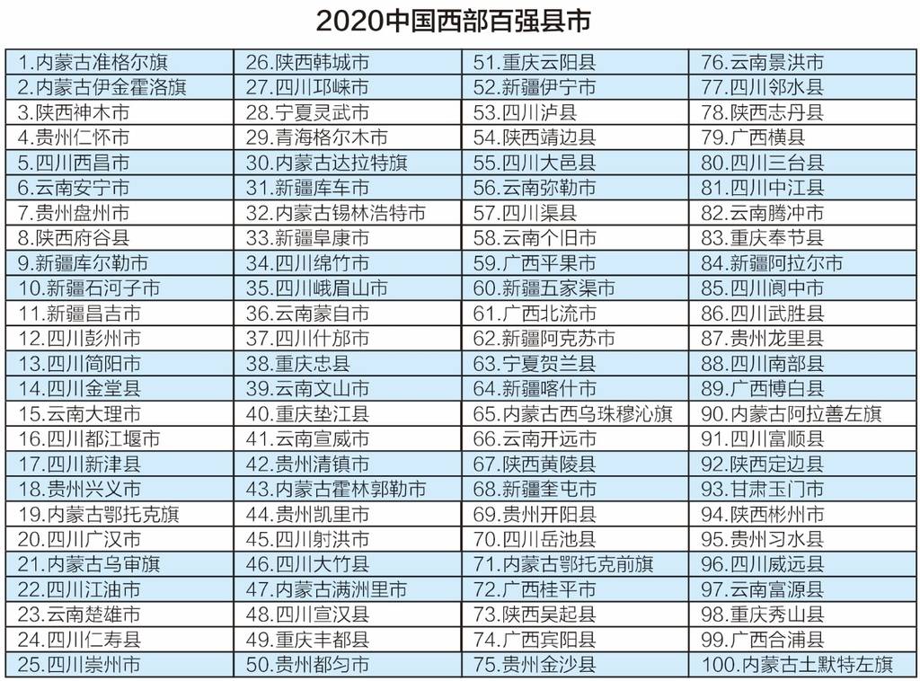 《报告》显示,2020中国西部百强县市分布在11个省(自治区、直辖市),分别为四川29个、内蒙古12个、云南12个、新疆11个、贵州10个、陕西9个、广西7个、重庆6个、宁夏2个、甘肃1个、青海1个。其中,西昌市为四川县域发展的“领头羊”,紧随其后分别为彭州市、简阳市、金堂县、都江堰市、新津县、广汉市、江油市、仁寿县、崇州市、邛崃市、绵竹市、峨眉山市、什邡市、射洪市、大竹县、宣汉县、泸县、大邑县、渠县、岳池县、邻水县、三台县、中江县、阆中市、武胜县、南部县、富顺县以及今年首次上榜的威远县。