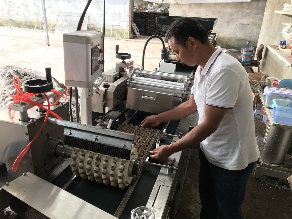 蒯世军在基地里一直忙活着,这个季节应该播种白菜。在主屏幕上按下按键,流水线程控多功能播种机转动起来,蒯世军将55厘米长、30厘米宽的育苗穴盘放到装盘机上,播种机通过红外线感应,自动将育苗基质铲到穴盘上。