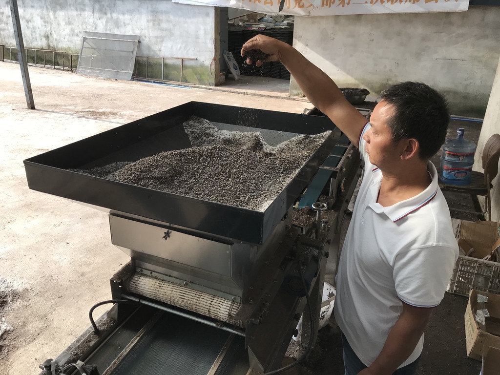 一张穴盘有105个孔,可种105颗白菜种子。穴盘覆盖育苗基质后,经过输送带运至滚桶处时,种子自动种在对应的穴中,“然后是浮土‘盖种’,机器浇水,整个一套流程都是红外线感应,事先在电脑设置好参数就行了。”这台播种机是蒯世军从浙江的厂家定制的,和传统播种机只能播种单一蔬菜不同,这台流水线程控多功能播种机可播种水稻、玉米、蔬菜三大品类,播种时间也大大缩短:一张育苗穴盘从装料到盖种、浇水,整个播种流程只要3秒钟。蒯世军算了一笔账:同样是1小时的时间,使用智能播种机相当于完成了120人的播种工作量。