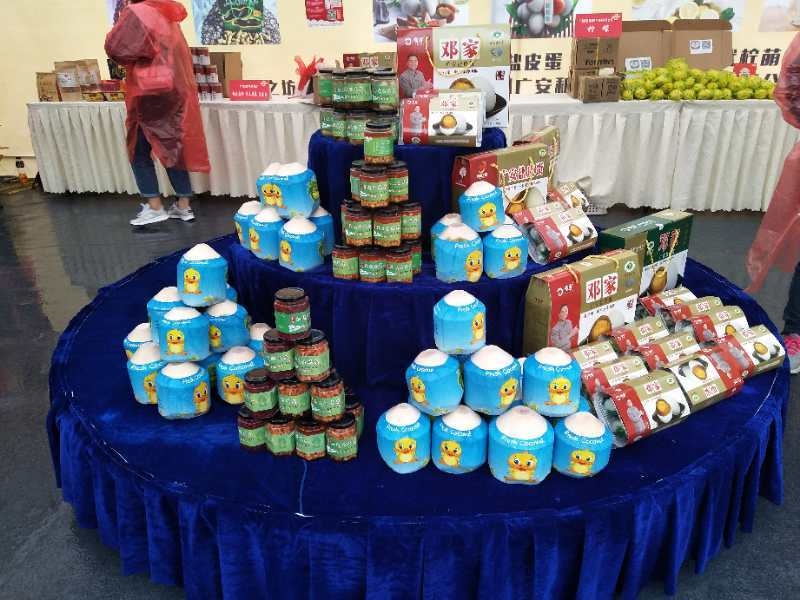 电商节现场,广安盐皮蛋、龙安柚、岳池米粉、华蓥蜜梨、武胜自热火锅、醉巴斯牛肉等广安本地知名农特产品在各个展台上展示,尽管当天还下着大雨,但仍然引得众多市民前来咨询了解并品尝购买。