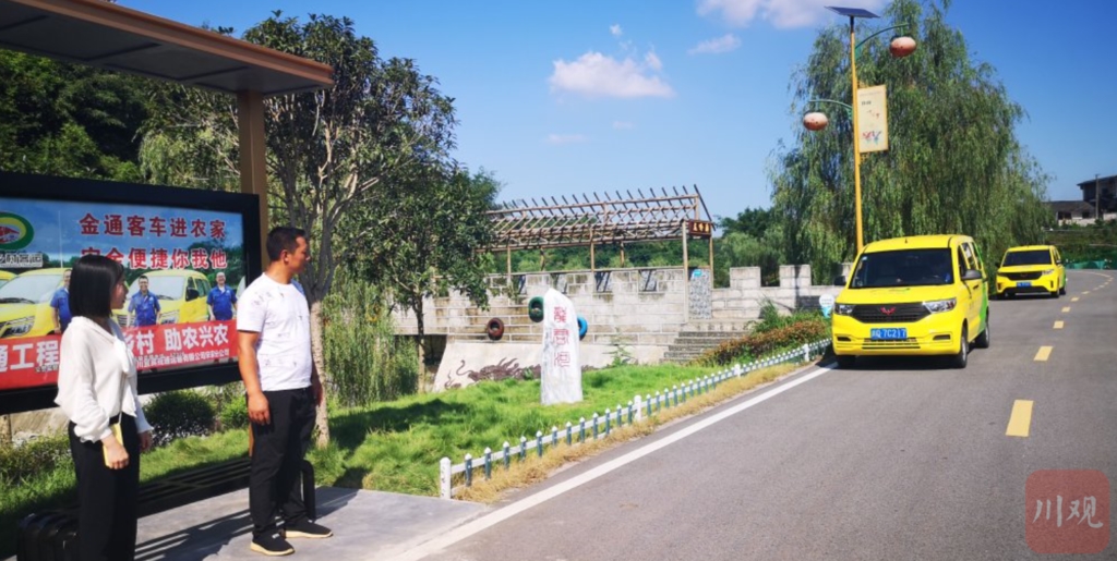 宜宾市翠屏区牟坪镇龙兴村,带有遮阳盖和座椅的招呼站上,村民漆介蜀正在等车。“以前客运车从前面的大马路走,现在‘小黄车’开到我们的农业园里来了。”他说,现在在家门口就能搭上公交,一些零散农产品也能带上车运出去,方便多了。