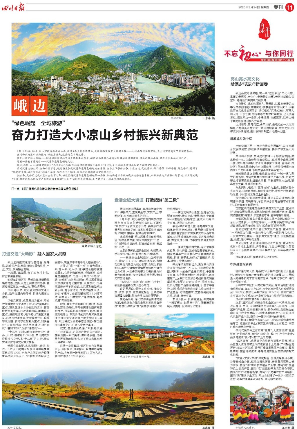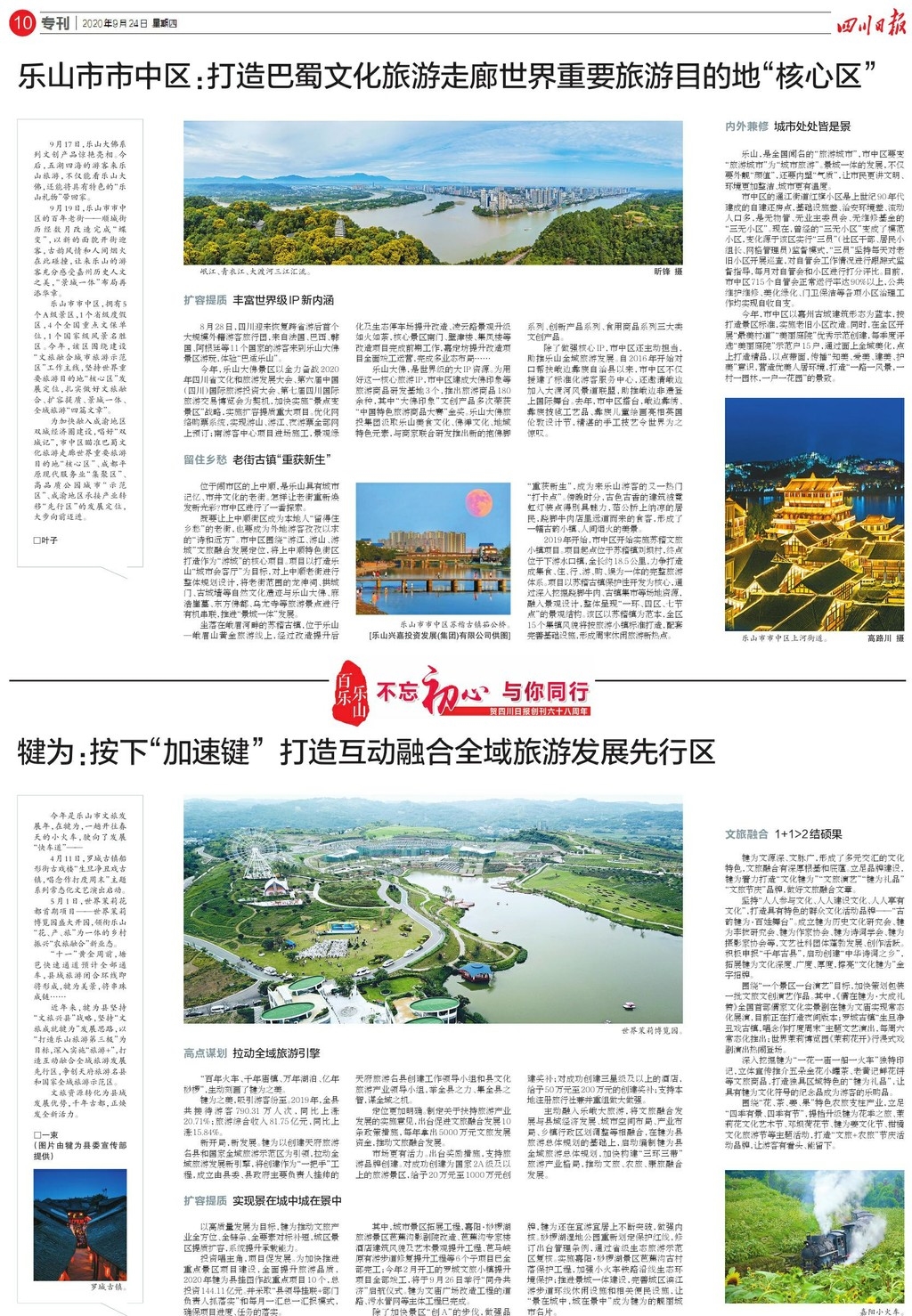 今日,《四川日报》以“百乐乐山”为主题,用4个整版的规模呈现乐山文旅发展新模式、新技术、新场景、新消费、新空间,并以乐山市市中区、沙湾区、犍为县、井研县、峨边彝族自治县为样本,观察世界级文旅IP打造、工旅融合、全域旅游、农旅融合、大小凉山乡村振兴发展路径。