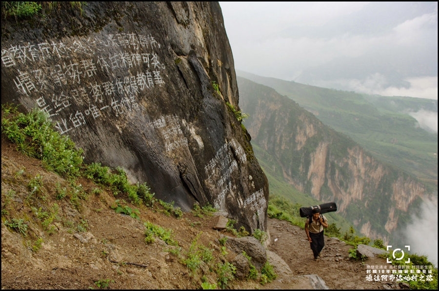 ●过去进出阿布洛哈村的通道就是一条垂直落差近2000米,最强壮的汉子徒步上坡最快也要4小时的悬崖羊肠路。 拍摄于2007年7月12日