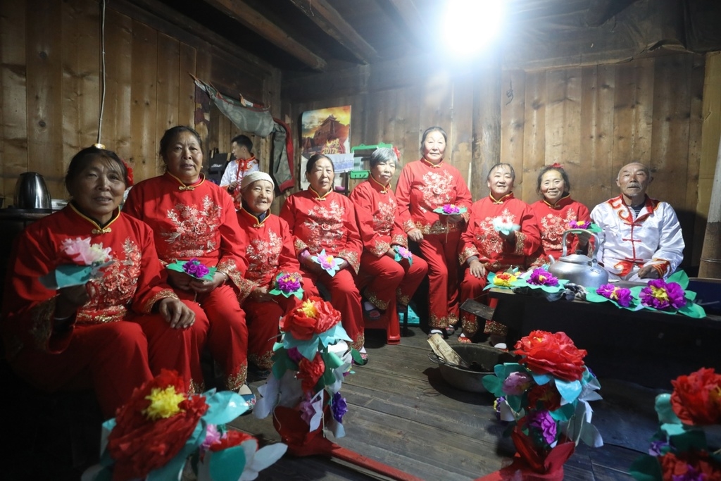 “正月去看灯,正月去看什么灯,正月元宵灯……”9月24日,在松潘县镇江关镇五里堡村,10多位村民围坐一团,边唱歌边做手工花灯。“我们村前两天在县上拿了两个一等奖,这两天村里人都很高兴。”五里堡村村委会主任许永峰说。