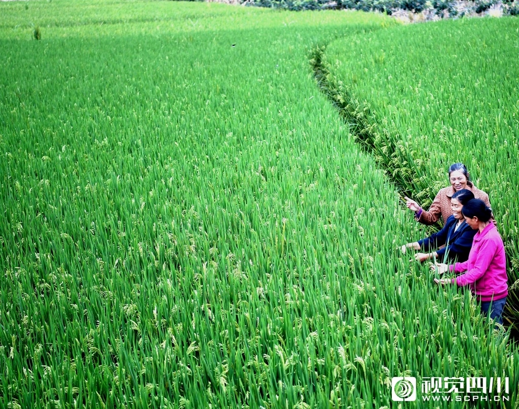 9月22日,德昌县德州镇泸塘村田间里100余亩杂交水稻生长茂盛,当地村民在杂交稻超高产栽培田边高兴地说:“这个杂交水稻比我们自己栽培的水稻长得好,又高、又饱满、籽又多!”