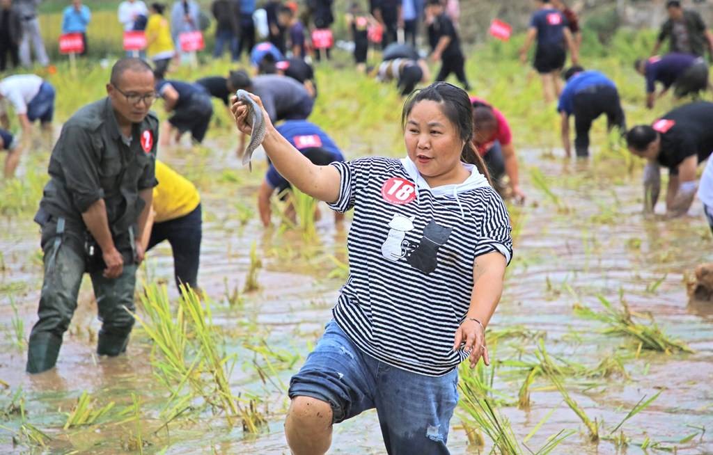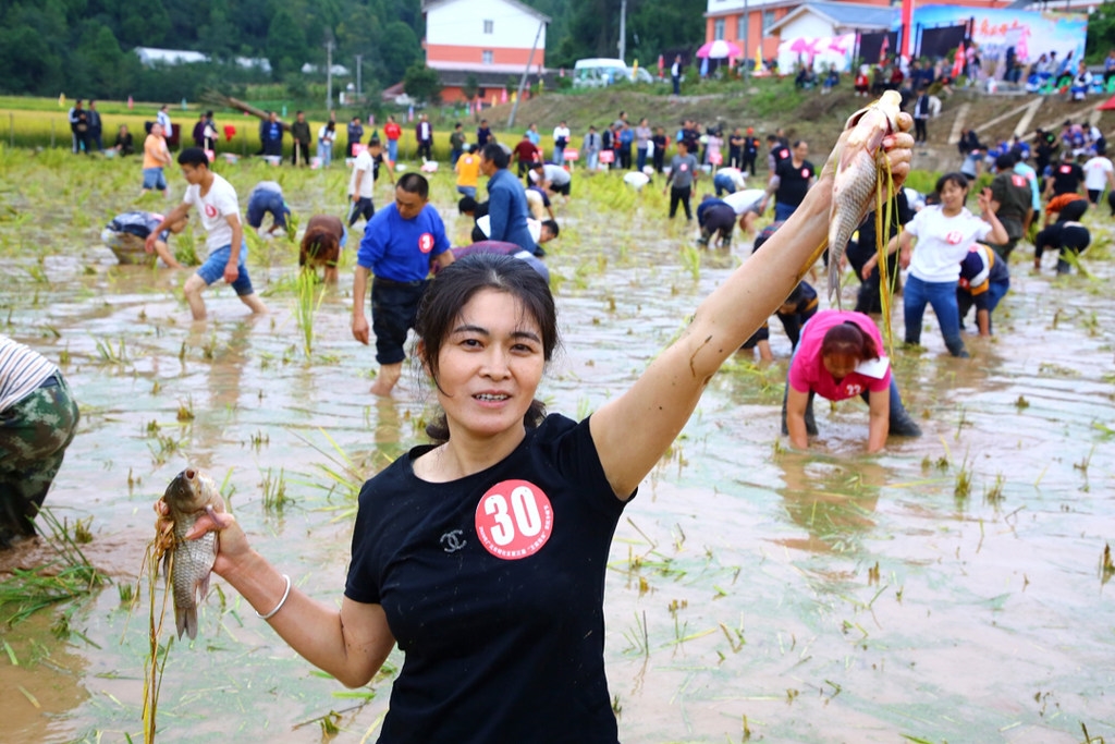 “抓鱼比赛开始!”一声口哨响起,148名村民脱下鞋子,挽起裤腿,冲入稻田,弯腰抓鱼……