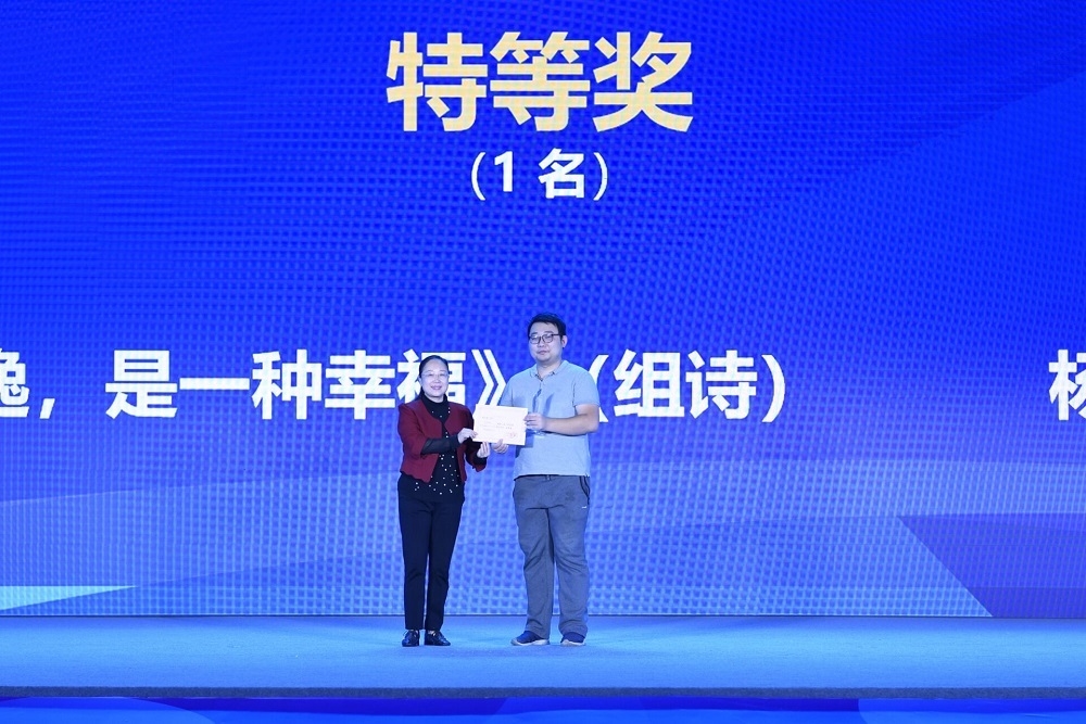来自黑龙江大庆市的作者杨文霞,凭借诗歌《安逸,是一种幸福》获得备受瞩目的特等奖,她在成都工作的儿子苏欣然代她前来,从颁奖嘉宾、四川省文化和旅游厅副厅长严飒爽手中接过了奖杯、证书。