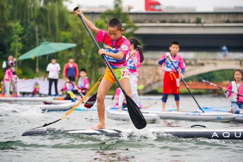9月26日一大早,天公虽然不作美,飘着蒙蒙细雨。但锦城湖上却是热闹非凡。这里正在2020天府绿道SUP桨板公开赛。SUP(Stand-Up Paddling,站立划水板或滑水桨板。顾名思义,站在板子上划水,起源是早年间夏威夷冲浪教练为教导学员时方便移动而创立,最近在全球普及开来。SUP是一种非常简单易学,老少咸宜的运动。本次赛事共设公开组(5公里技术竞赛 + 200米冲刺赛)、新秀组(3公里耐力赛)、青少年组(1公里技术赛)和少儿组(200米竞赛速)、团队赛(4人,至少1名异性200米技巧赛)五个组别,总奖金达到7万元。活动现场,300多名桨板高手与爱好者积极热身,准备在锦城湖中一展身手。