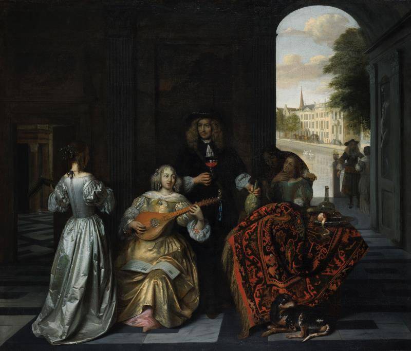本次展出的这幅霍赫的作品唤起了人们对阿姆斯特丹富商阶层奢华生活的想象。画作中展示了一群快乐的伙伴在运河屋中尽情享受音乐和美酒,这是这座城市的居民在17世纪所能享有的极大繁荣。暗室与背景中的阳光形成对比,闪耀光泽的缎面礼服在其中显得醒目而鲜亮。透过背景中的门可以看到阳光明媚的运河景色,它营造出一种宁静、愉悦、富丽堂皇的氛围——清晰界定的空间和门扇,这样的构图方式是17世纪荷兰画家最热衷的绘画技巧。