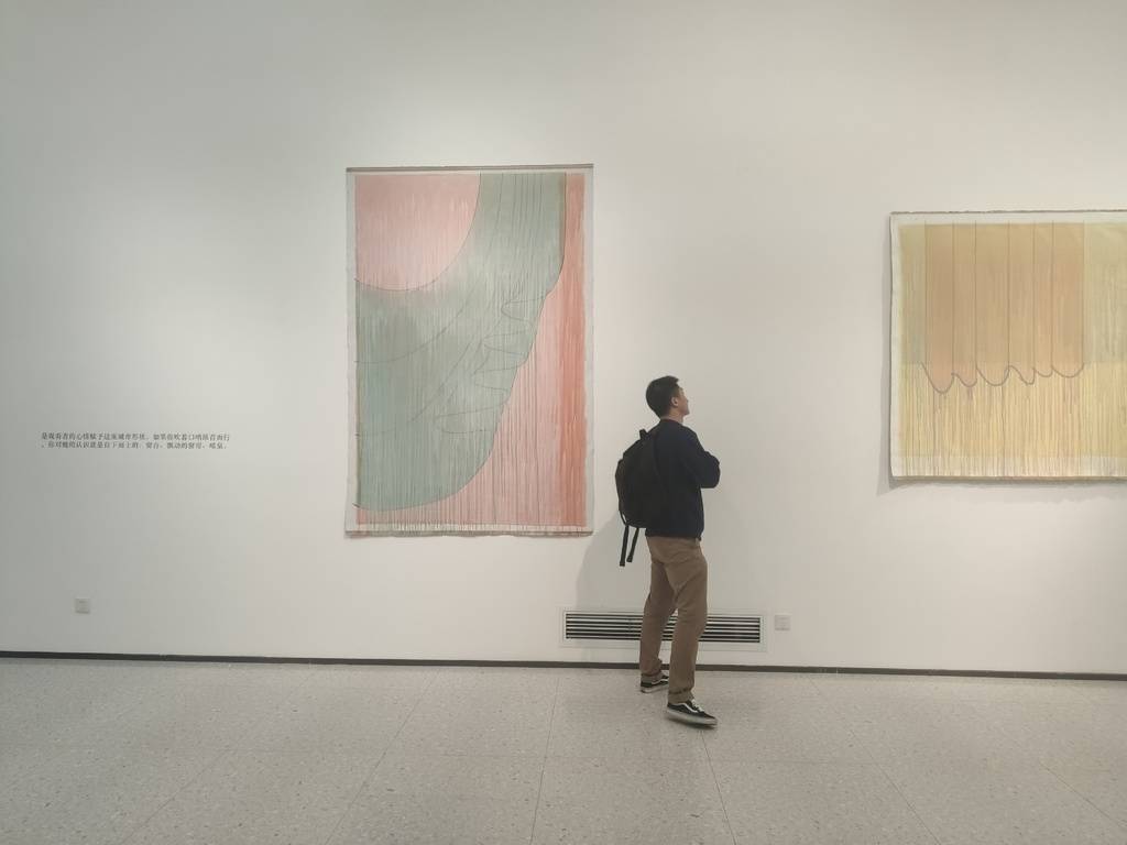 循着色彩走入展厅,首先映入眼帘的为“轻盈的城市”单元。这里,林羽龙的绘画系列作品《无题》悬挂于此。轻盈的材质,搭配着浅色清新色调,像是一股清风徐来,吹佛着画中描摹的城市场景:静默的窗台、飘飞的窗帘,和涌动的喷泉。林羽龙从熟悉的城市场景,提取意象,并用自由的曲线将其组合成物像,使得作品呈现出一种秩序和非秩序的矛盾运动。这种抽象化处理方式,使得观众一进来,就感觉到作品呈现出一种“熟悉”场景,一种城市温柔、轻盈的气息扑面而来。