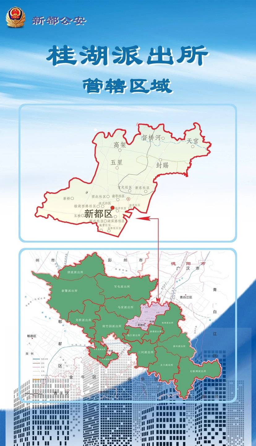 9月27日上午,成都市公安局新都分局城西派出所正式更名为桂湖派出所。桂湖派出所位于桂湖街道,辖区面积37.2平方公里,实有人口17.7万人。派出所党支部成立于1950年,2007年被公安部认定为一级派出所,现有民警34人,辅警49人。