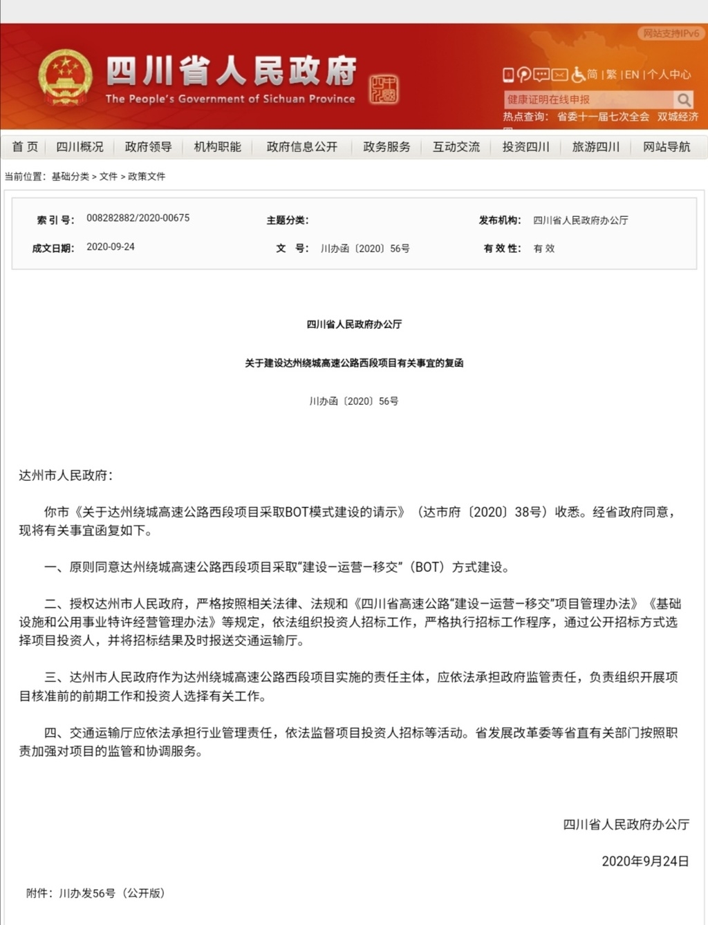 四川在线记者9月27日获悉,省人民政府办公厅日前发出《关于达州绕城高速公路西段项目采取BOT模式建设的请示》的复函: