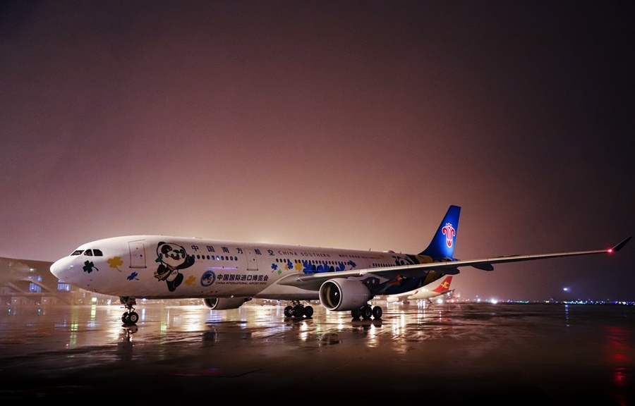 南航“进博号”主题彩绘客机是南航与中国国际进口博览局、国家会展中心(上海)合作推出的全球最新进博会主题彩绘飞机,此行是首次亮相成都。