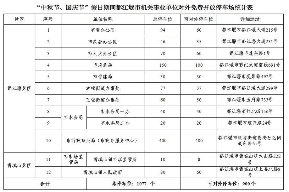 9月28日,记者从都江堰市获悉,为缓解游客“停车难”的问题,都江堰市推出机关后勤资源与社会开放共享“便民举措”:免费提供900个机关单位停车位,供市民游客使用。