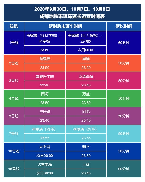 9月28日,记者从成都地铁获悉,9月30日、10月7日、10月8日,地铁在各线路延长运营服务时间50-60分钟不等,并从客运组织、设备保驾、安保综治等方面精心筹划、提前准备,确保节日期间乘客出行安全、有序。