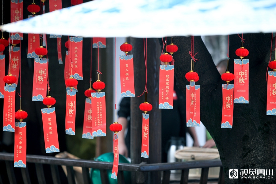 人们一边品尝着月饼,一边品味着古风曲韵,茶艺师们手中的长嘴铜茶壶有生命力的飞舞旋转着,川剧演员也在现场表演着川剧变脸、吐火……演出结束后,市民们跟随身着汉服的礼仪人员共同拜月祈福,放逐花灯,大家共同为国泰民安,家庭顺遂许下美好祝福。