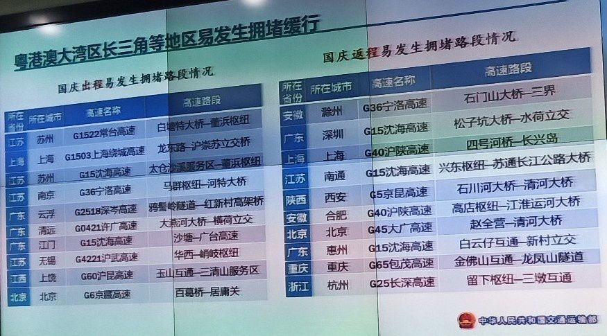 区公路网易发生拥堵缓行,上海、苏州、南京、深圳、杭州、北京、西安、重庆等城市及周边进出城高速公路易发生拥堵缓行。G15沈海高速苏州、南通、深圳段, G1522常台高速苏州段, G36宁洛高速南京、滁州段,G40沪陕高速上海段等路段易发生拥堵缓行。