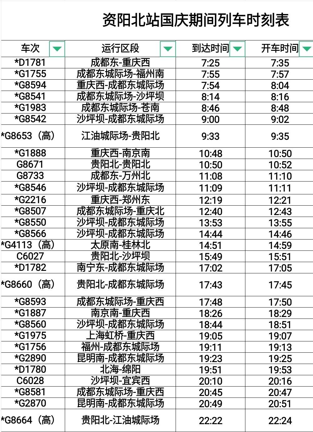 据国庆期间列车时刻表显示,从资阳前往成都,最晚发车时间由之前的晚上20:05改为22:24,25分钟后到达成都东站;从成都回资阳,早上最早可选择6:56的班次,7:25到达资阳北站。