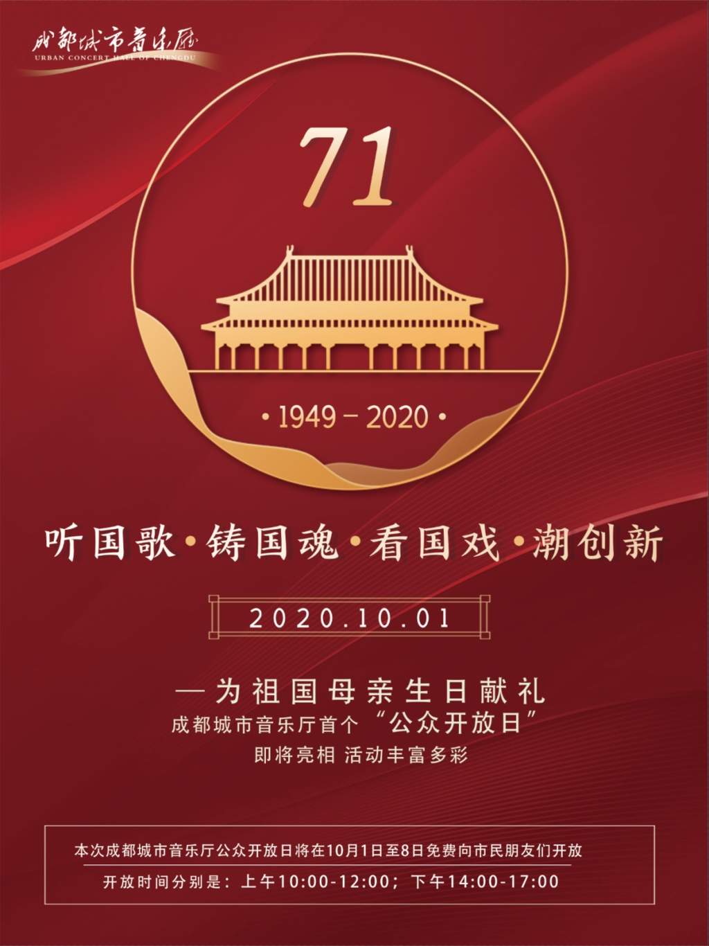 听国歌、铸国魂、潮创新、看国戏。这个国庆,成都城市音乐厅国庆“公众开放日”系列活动的序幕也被拉开。这也是成都城市音乐厅从建成后举行的首个“公众开放日”活动,免费向观众开放,以回馈公众对成都城市音乐厅的关心和关注,并通过“国歌·国魂”、戏曲特展、首届先锋潮创赛展览等系列丰富多彩的主题活动,体现出成都城市音乐厅的人文关怀、艺术气息,也让更多的人走进音乐厅、了解音乐厅、享用音乐厅。10月5日、6日,京剧《白蛇传》将在成都城市音乐厅上演,拉开天府戏剧季的序幕。京剧《白蛇传》将由国家一级演员,第26届梅花奖获得者,“四川省十佳演员”刘露饰演白素贞;国家一级演员,著名京剧表演艺术家叶少兰先生入室弟子金喜全饰演许仙。