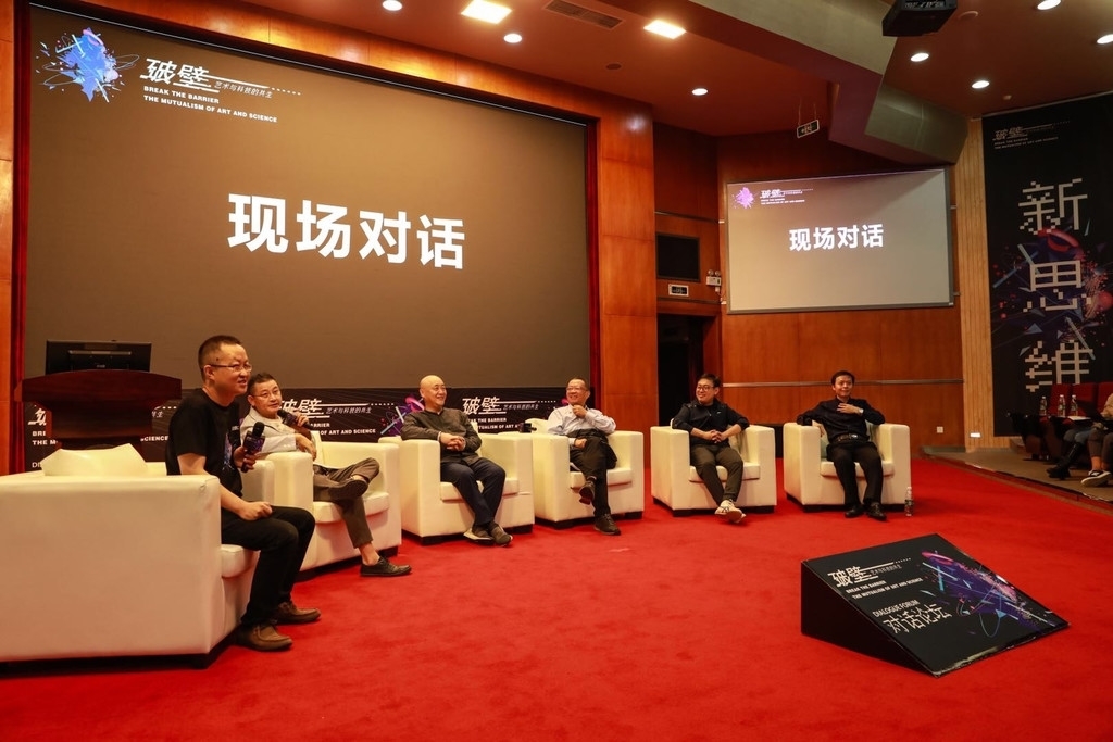 联展期间,举办了”破壁—科技与艺术共生”的对话论坛,教育部美育教指委副主任杜卫、美术学院副院长张杰、中央美术学院邱宇、电子科大王承云及黄廷祝教授分别作主题报告,带来题为《科技与艺术:在人才培养领域的互补与协同》、《科技与艺术的一次邂逅》、《新视角下的生命感知》、《科技与艺术:任何科技最终回归于艺术,任何艺术因为科技而发展》及《信息技术与艺术:挑战性艺术体验中培养新工科人才》的精彩分享,并在现场与师生对话,分享了对科技与艺术结合的深入思考。