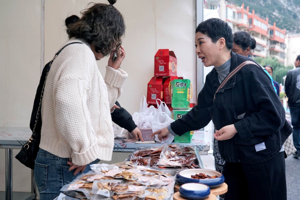 记者在玉轮桥上的松潘县展位看到,来自该县的花椒、牛肉制品,以及与松潘县相关的文创产品引得游客驻足。该县展位的工作人员告诉记者,“今天我们展销的是带有‘四川扶贫’标志的松潘花椒,目前我们已经与浙江省建立起了对口供销关系。凭借花椒种植,直接带动了松潘当地的贫困户就业和脱贫。”