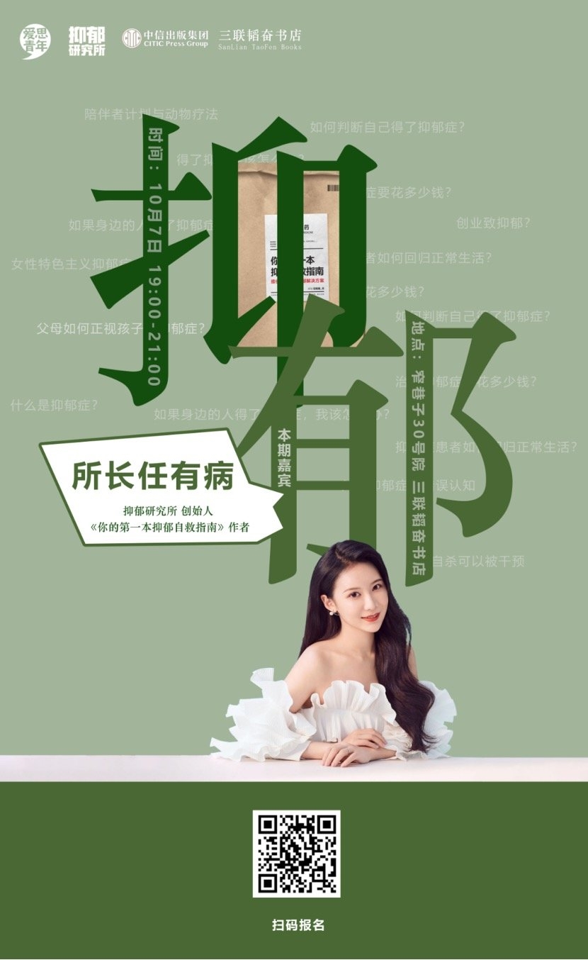 据不完全统计,全球共3.5亿抑郁症患者。我国的9000万患者中,每年有28万人因抑郁症而自杀。遗憾的是,约有90%的抑郁患者没有意识到自己患病并及时就医。10月7日,三联联合爱思青年、抑郁症研究所、中信出版集团,将一起举办一场特别的抑郁沙龙。“所长任有病”将在这场抑郁沙龙中,与爱思青年理事长周玉亮对话,深度探讨抑郁症。
