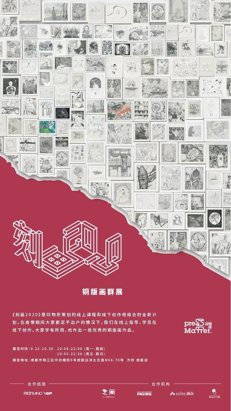 在2019年年末,印物所发起铜版画征集。在今年年初,共收到1174位创作者的铜版画投稿。最终选定了68位创作者组成这次“刻画2020”的作者阵容。疫情期间,印物所以线上课程的形式与68位创作者见面。在经过一系列的课程及指导后,68位创作者完成了作品的设计。在印物所的制版、印制下,68幅铜版画得以展示出来。