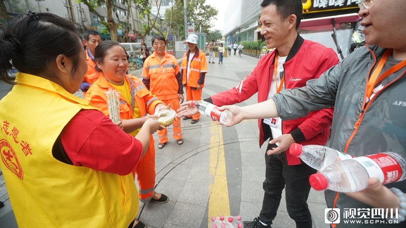 当天下午,社区志愿者和工作人员沿街为正在打扫的环卫工送上“温暖面”
