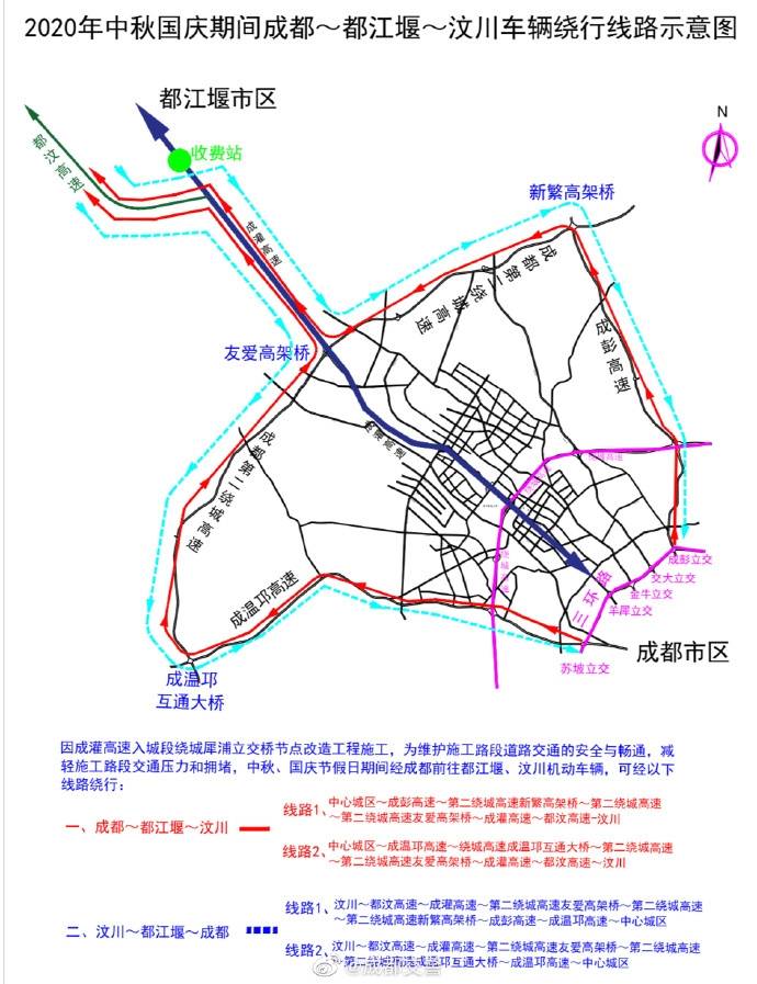 9月30日,记者从成都市交管局获悉,因成灌高速入城段绕城犀浦立交桥节点改造工程施工,为维护施工路段道路交通的安全与畅通,减轻施工路段交通压力和拥堵,中秋、国庆节假日期间经成都前往都江堰、汶川机动车辆,可经以下线路绕行:
