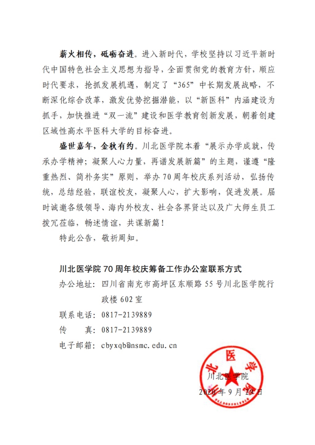 2021年9月,川北医学院将迎来70华诞。9月29日,川北医学院发布第1号公告,向长期以来关心支持学校建设改革发展的各级领导、海内外校友、社会各界贤达以及广大师生员工致以诚挚的感谢和崇高的敬意!