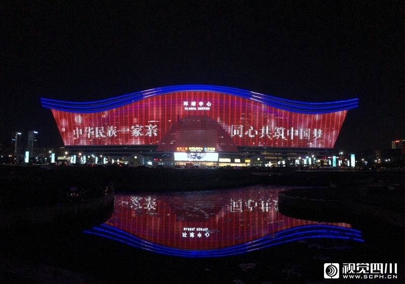 9月29日,为庆祝双节,成都新世纪环球中心、天府国际金融中心双子塔等地标上演了炫彩灯光秀,用灯光表白祖国。环球中心大屏和双子塔身上滚动播放着“山河无恙,万家团圆,祝福祖国”等字样,欢庆佳节、与民同乐。