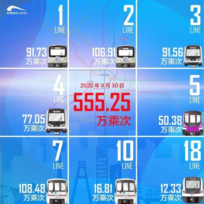 9月30日,5、7、10号线客运量及地铁49个车站进站客流同步刷新历史纪录。地铁线网车站单日进站量最高为成都东客站 、犀浦站、春熙路站,进站量依次为15.93万、11.23万、10.82万人次。线网第三座三线换乘站火车南站换乘量达23.28万人次,线网全日开行列车4040列次,增开27列次。