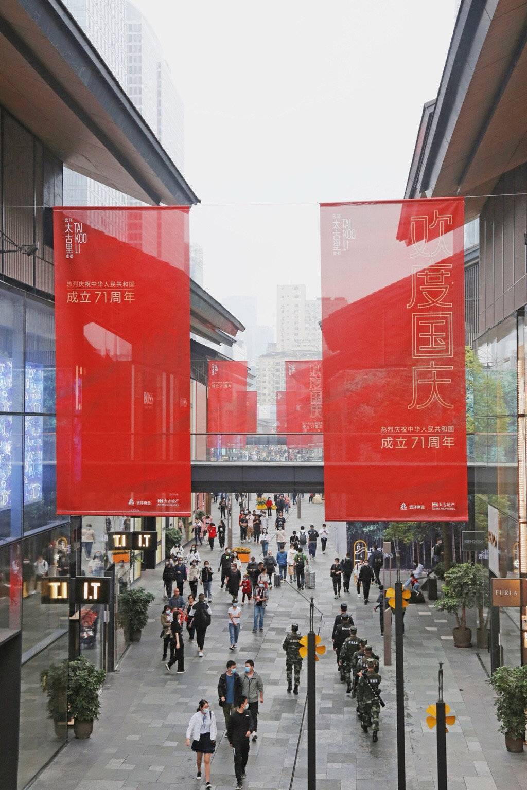 春熙路商圈部分广场、街道摆上了一盆盆色彩鲜艳、姿态万千的的花卉。各主要路段、重要位置悬挂国旗,庄重而热烈,大街小巷处处飘扬着"中国红",一眼望去红色的海洋无不表达着“爱国心”。
