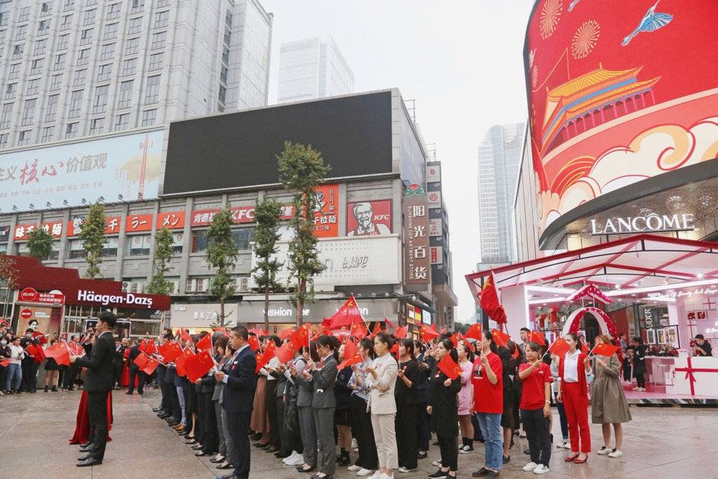 “五星红旗迎风飘扬,胜利歌声多么响亮。歌唱我们亲爱的祖国,从今走向繁荣富强……”10月1日上午9:40,一场热情洋溢的大合唱《歌唱祖国》在春熙路街头唱响。
