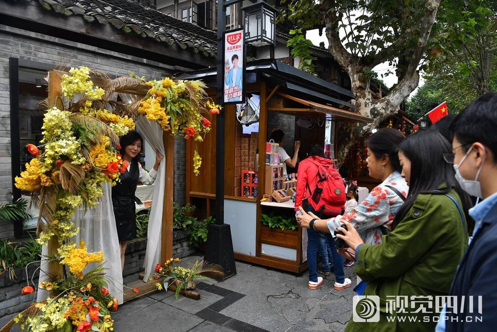 10月1日,虽然阴雨不断,但成都的各大近郊景区人流量不断增加。在城中心的宽窄巷子,上午受到下雨影响,游客量稍少,但到下午3点左右,游客量剧增。