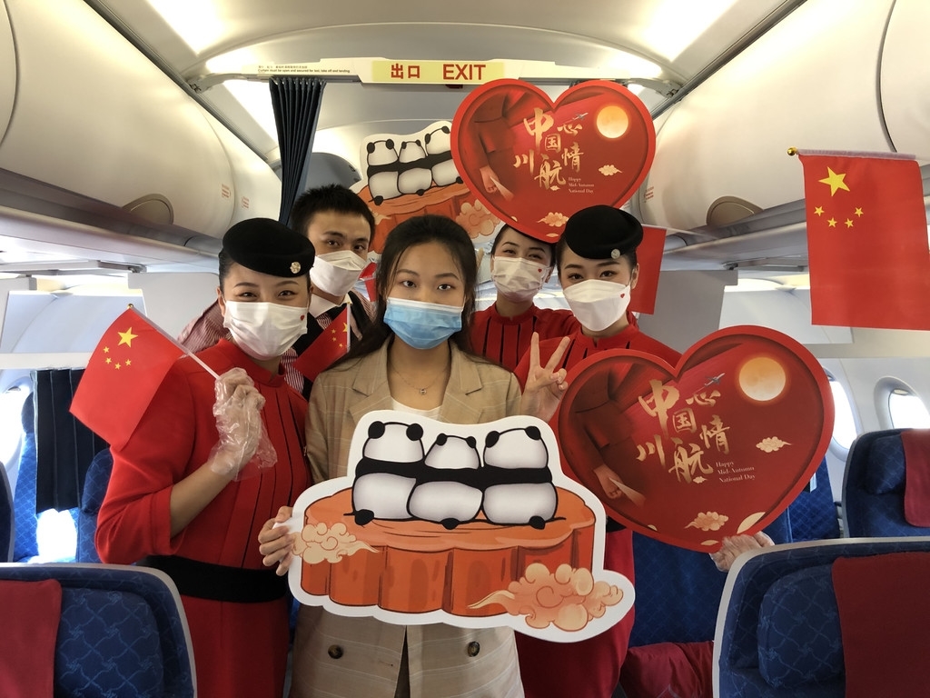 “每逢节庆日,我们都会在机上开展一些特色主题活动,与旅客共同过节。”川航客舱部相关负责人说,今年恰逢中秋、国庆双节同庆,川航特别策划了以“中国心·川航情·中秋意——家国共此时”为主题的特色活动,9月29日至10月1日连续三天,在百余个航班上开展,白天以“中国心·川航情”国庆为主题,晚上则以“中秋意”中秋为主题。